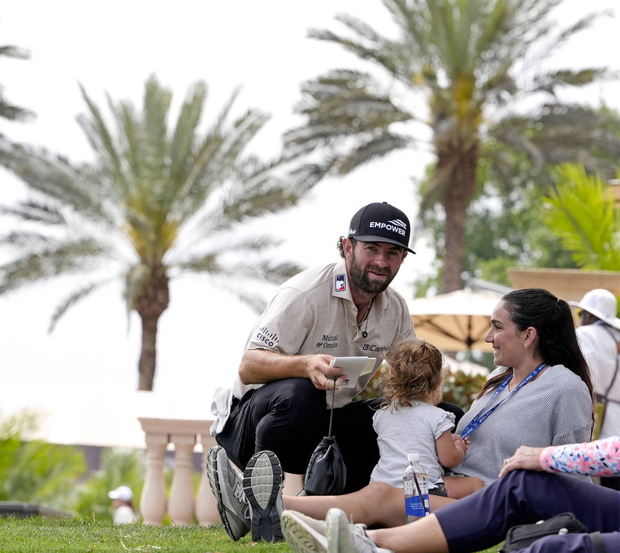 PONTE VEDRA BEACH, FL – MARCH 13: PGA, Golf Herren golfer Cameron Young with his wife Kelsey Dalition and their daughter sitting on the clubhouse lawn after finishing his second round of The Players Championship on March 13, 2026, at TPC Sawgrass in Ponte Vedra Beach, Florida. Photo by Brian Spurlock/Icon Sportswire GOLF: MAR 13 PGA THE PLAYERS Championship EDITORIAL USE ONLY Icon26031362