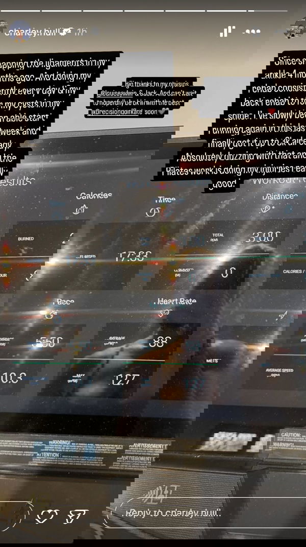 “Since snapping the ligaments in my ankle 4 months ago. And doing my rehab consistently every day & my back rehab for my cysts in my spine. I’ve slowly been able to start running again in this last week and finally got it up to 3K already. Absolutely buzzing with that and the Pilates work is doing my injuries really good,” Charley Hull wrote, sharing the details of her workout session on her Instagram Story.