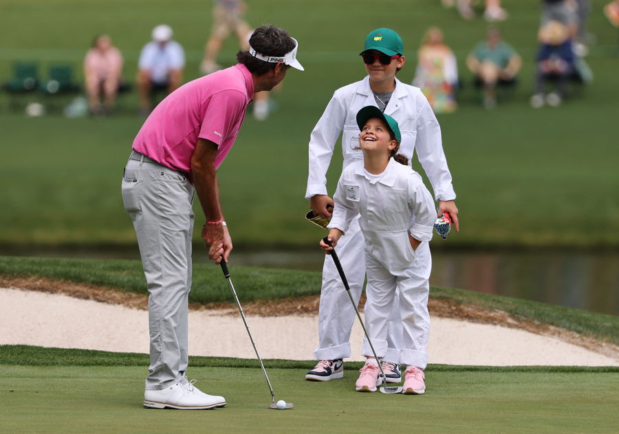 Golf – The Masters – Augusta National Golf Club, Augusta, Georgia, U.S. – April 10, 2024 Bubba Watson of the U.S. makes a putt on the 6th green alongside his daughter, Dakota and son, Caleb during the par 3 contest REUTERS/Mike Blake