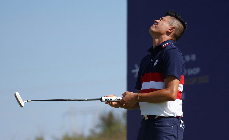 Golf – The 2023 Ryder Cup – Marco Simone Golf & Country Club, Rome, Italy – October 1, 2023 Team USA’s Collin Morikawa reacts after a missed birdie putt on the 13th green during the Singles REUTERS/Phil Noble
