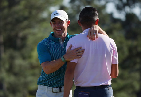 Golf – The Masters – Augusta National Golf Club – Augusta, Georgia, U.S. – April 10, 2022 Northern Ireland’s Rory McIlroy and Collin Morikawa of the U.S. celebrate on the 18th green after they both chipped in for birdie from the bunker during the final round REUTERS/Brian Snyder