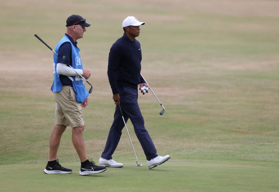 Golf – The 150th Open Championship – Old Course, St Andrews, Scotland, Britain – July 12, 2022 Tiger Woods of the U.S. with his caddie, Joe LaCava, during practice REUTERS/Paul Childs
