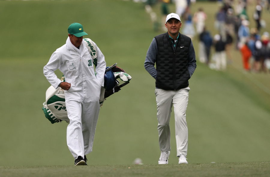 Golf – The Masters – Augusta National Golf Club – Augusta, Georgia, U.S. – April 9, 2022 Scottie Scheffler of the U.S. with his caddie walk up the 3rd fairway during the third round REUTERS/Mike Blake