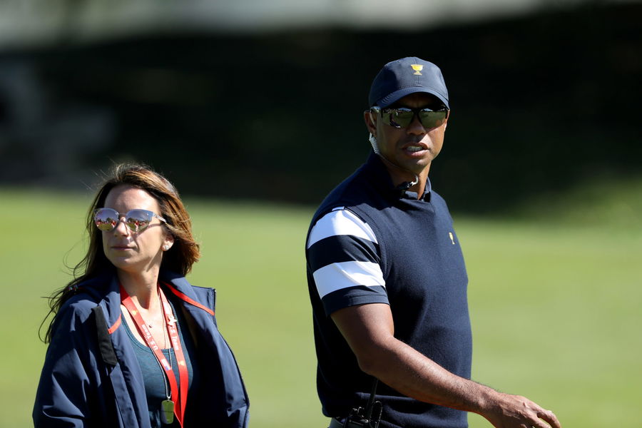 JERSEY CITY, NJ – OCTOBER 01: Tiger Woods one of the United States team assistant captain’s on the first hole with Erica Herman during the final day singles matches matches in the 2017 Presidents Cup at the Liberty National Golf Club on October 1, 2017 in Jersey City, New Jersey. (Photo by David Cannon/Getty Images)