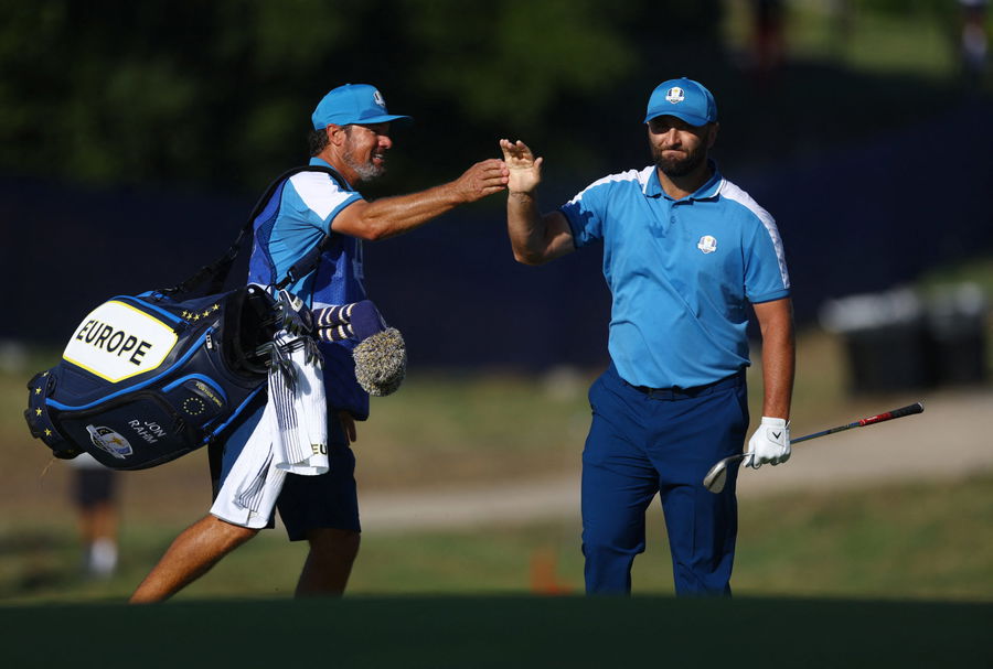 Golf – The 2023 Ryder Cup – Marco Simone Golf & Country Club, Rome, Italy – September 29, 2023 Team Europe’s Jon Rahm celebrates with his caddie after chipping in on the 10th hole during the Foursomes REUTERS/Carl Recine