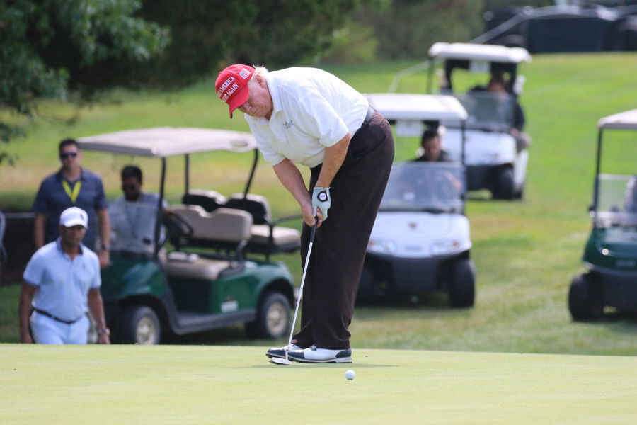 July 28, 2022; Bedminster, NJ, USA; Donald Trump during the Pro Am. The LIV Pro Am Tournament featured the former President of the United States, Donald Trump and his son Eric playing with with Dustin Johnson and Bryson DeChambeau at Trump National in Bedminster, NJ on July 28, 2022. .Mandatory Credit: Chris Pedota-USA TODAY NETWORK