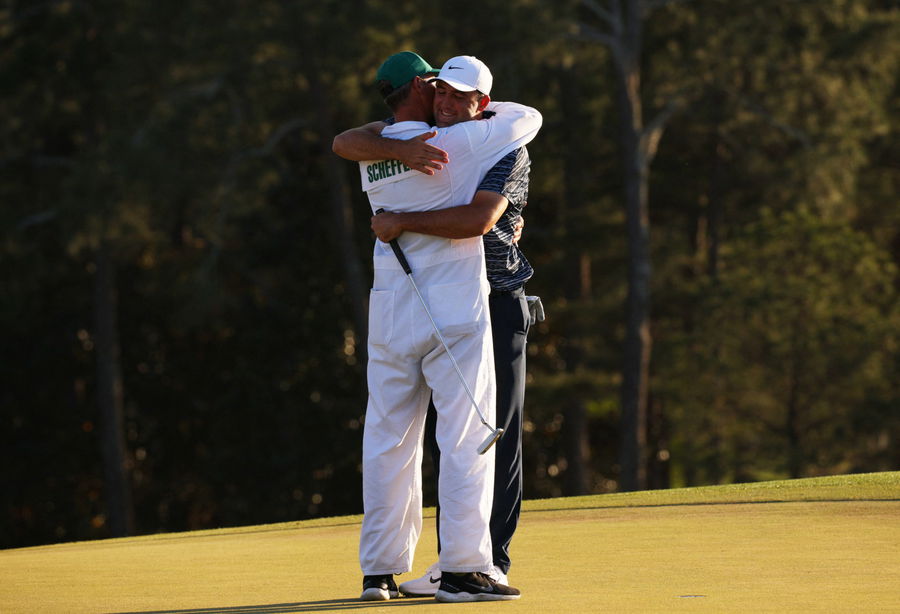 Golf – The Masters – Augusta National Golf Club – Augusta, Georgia, U.S. – April 10, 2022 Scottie Scheffler of the U.S. celebrates on the 18th green with caddy Ted Scott after winning The Masters REUTERS/Brian Snyder