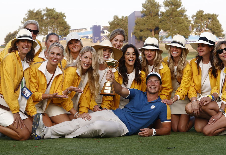 Golf – The 2023 Ryder Cup – Marco Simone Golf & Country Club, Rome, Italy – October 1, 2023 Team Europe’s Viktor Hovland poses with the trophy and the partners of his teammates as they celebrate after winning the Ryder Cup REUTERS/Guglielmo Mangiapane