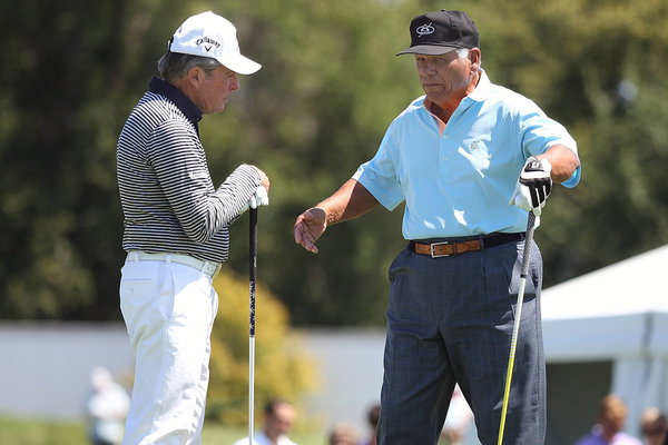 Aug. 1, 2015 – Blaine, MN, U.S. – Lee Trevino (right) talked with Gary Player on the first tee during the Greats of Golf Challenge. JIM GEHRZ