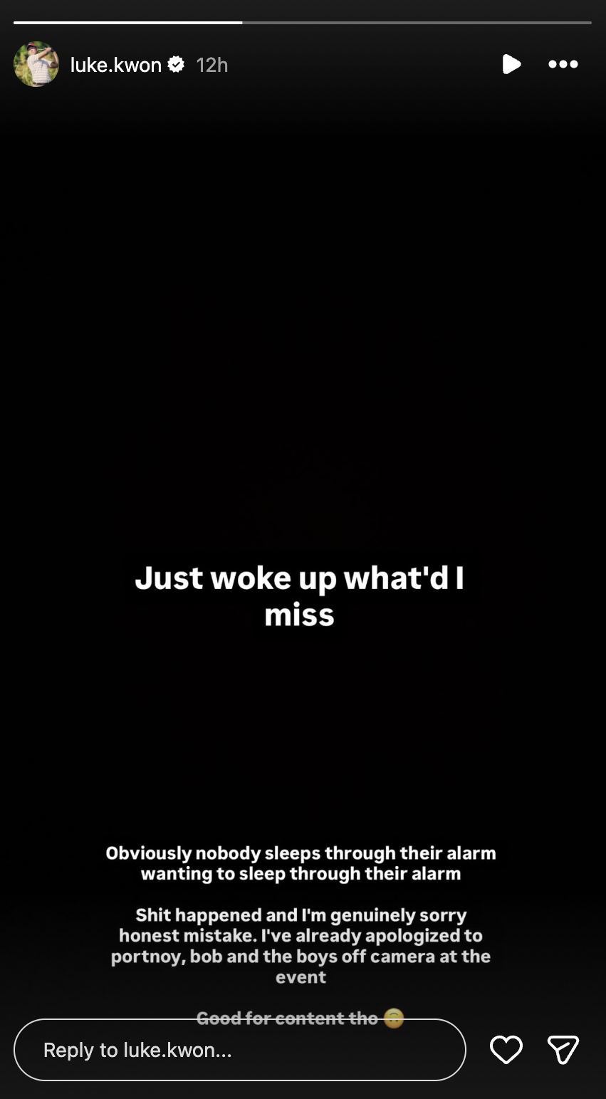 “Just woke up what’d I miss,” Kwon sarcastically wrote on his Instagram story later before adding an apology. “Obviously nobody sleeps through their alarm wanting to sleep through their alarm. S— happened and I am genuinely sorry honest mistake. I’ve already apologized to portnoy, bob and the boys off camera at the event. Good for content tho 🙃.”