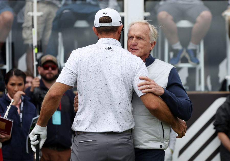 Golf – The inaugural LIV Golf Invitational – Centurion Club, Hemel Hempstead, St Albans, Britain – June 9, 2022 Team 4 Aces’ Dustin Johnson of the U.S. with Chief executive of LIV Golf Investments Greg Norman during the first round Action Images via Reuters/Paul Childs