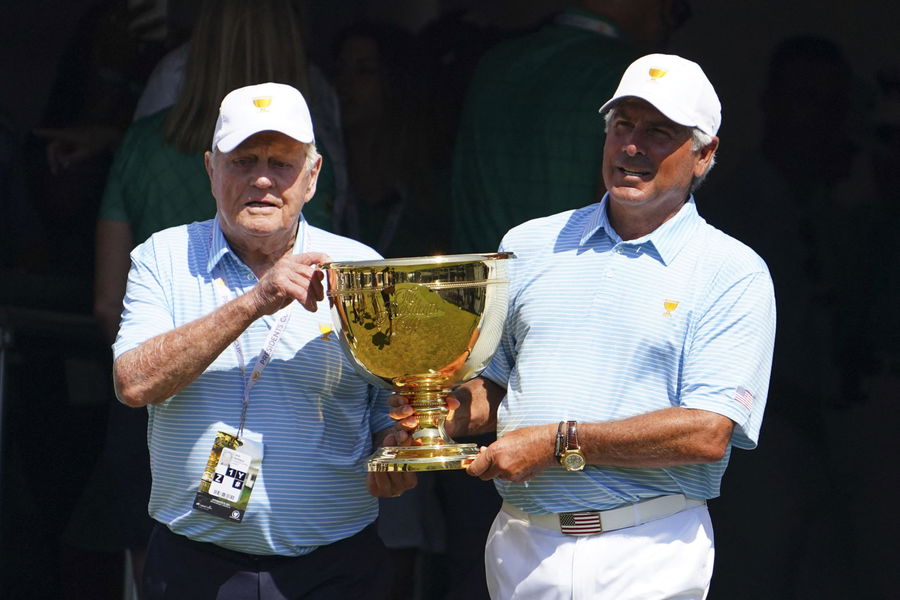 Sep 22, 2022; Charlotte, North Carolina, USA; Jack Nicklaus (left) and Team USA assistant captain Fred Couples (right) carry the trophy to the first tee during the foursomes match play of the Presidents Cup golf tournament at Quail Hollow Club. Mandatory Credit: Peter Casey-USA TODAY Sports