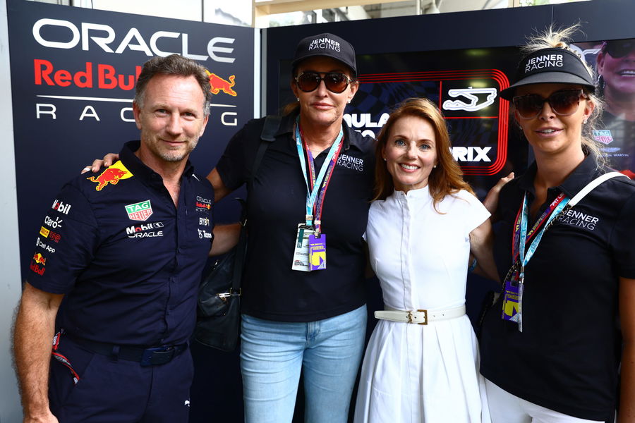 MIAMI, FLORIDA – MAY 08: (L-R) Red Bull Racing Team Principal Christian Horner, Caitlyn Jenner, Geri Horner and Sophia Hutchins pose for a photo before the F1 Grand Prix of Miami at the Miami International Autodrome on May 08, 2022 in Miami, Florida. (Photo by Mark Thompson/Getty Images)
