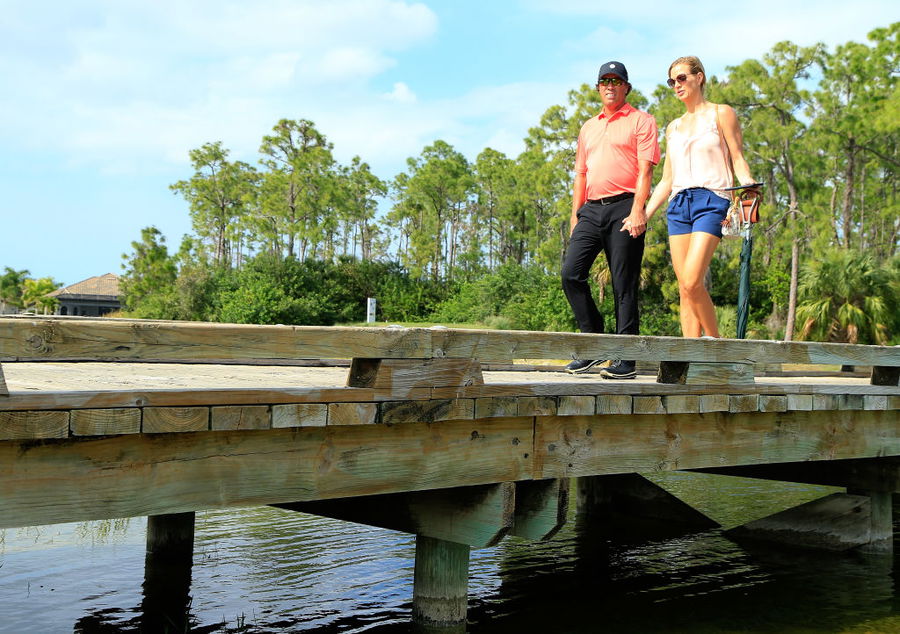 NAPLES, FL – FEBRUARY 16: Stephen Ames of Canada and his wife Jodi Ames walk on a bridge during the second round of the Chubb Classic held at The Classics at Lely Resort on February 16, 2019 in Naples, Florida. (Photo by Michael Cohen/Getty Images)