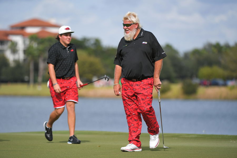 ORLANDO, FL – DECEMBER 18: John Daly and his son, John Daly II, are seen on the green during the PGA TOUR Champions first round of the PNC Championship at Ritz-Carlton Golf Club on December 18, 2021 in Orlando, Florida. (Photo by Ben Jared/PGA TOUR via Getty Images)