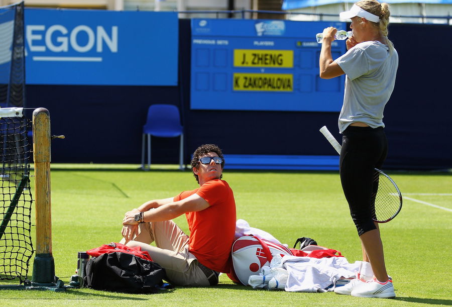EASTBOURNE, ENGLAND – JUNE 19: Golfer Rory McIlroy watches his girlfriend Caroline Wozniacki of Denmark practice during day four of the AEGON International on June 19, 2012 in Eastbourne, England. (Photo by Matthew Lewis/Getty Images)