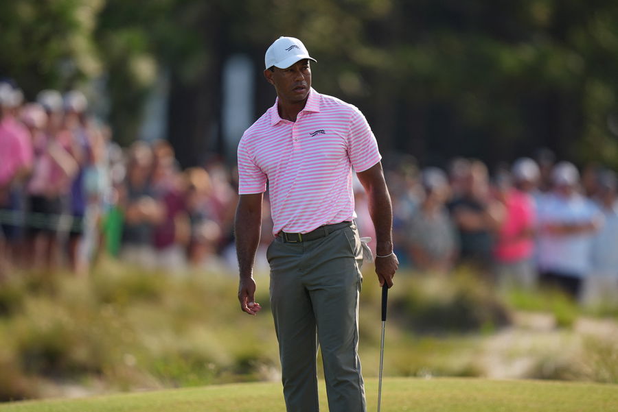 Jun 13, 2024; Pinehurst, North Carolina, USA; Tiger Woods watches his putt on the eleventh green during the first round of the U.S. Open golf tournament. Mandatory Credit: Jim Dedmon-USA TODAY Sports