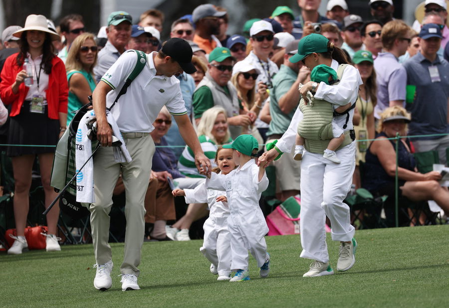 Golf – The Masters – Augusta National Golf Club, Augusta, Georgia, U.S. – April 10, 2024 Jordan Spieth of the U.S. with his wife, Annie Verret, and their children, Sammy and Sophie, and Maya Fowler, daughter of Rickie Fowler of the U.S. during the par 3 contest REUTERS/Mike Segar