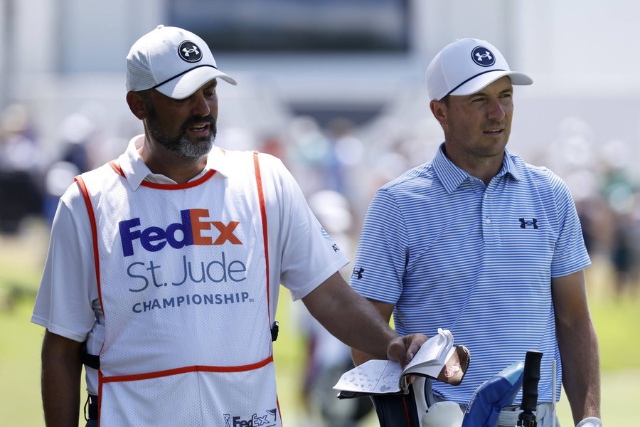 MEMPHIS, TN – AUGUST 09: Jordan Spieth of the United States and his caddie Michael Greller discuss a shot from the No. 18 fairway during the third round of the FedEx St. Jude Championship, August 9, 2025, at TPC Southward in Memphis, Tennessee. Photo by Matthew Maxey/Icon Sportswire GOLF: AUG 09 PGA, Golf Herren FedEx Cup Playoffs – FedEx St. Jude Championship EDITORIAL USE ONLY Icon250809024