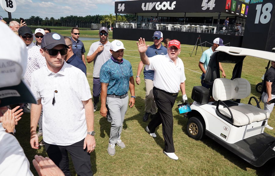 Oct 27, 2022; Miami, Florida, USA; Former President Donald Trump waves to supporters following his round in the Pro-Am tournament before the LIV Golf series at Trump National Doral. Mandatory Credit: John David Mercer-USA TODAY Sports