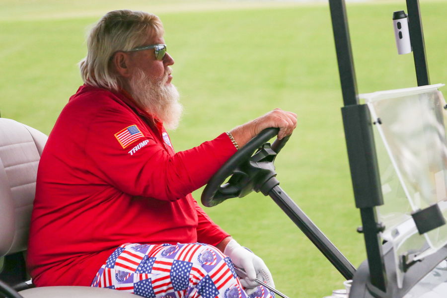 May 19, 2022; Tulsa, Oklahoma, USA; John Daly drives his golf cart on the tenth fairway during the first round of the PGA Championship golf tournament. Mandatory Credit: Michael Madrid-USA TODAY Sports