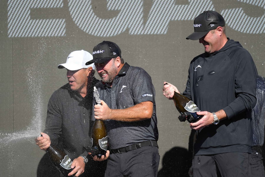Feb 10, 2024; Las Vegas, Nevada, USA; Smash GC team captain Brooks Koepka celebrates with teammates Jason Kokrak and Graeme McDowell after winning the team championship during the final round of the LIV Golf Las Vegas tournament at Las Vegas Country Club. Mandatory Credit: Lucas Peltier-USA TODAY Sports
