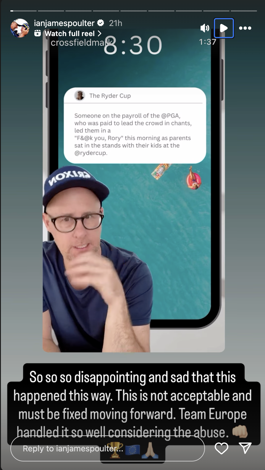 After the Ryder Cup wrapped up, LIV golfer Ian Poulter weighed in, siding with McIlroy and holding officials accountable. Sharing a video from @Crossfieldmark on his Instagram story, Poulter wrote: “So so so disappointing and sad that this happened this way. This is not acceptable and must be fixed moving forward. Team Europe handled it so well, considering the abuse. 👊🏻🏆🇪🇺🙏🏻.”