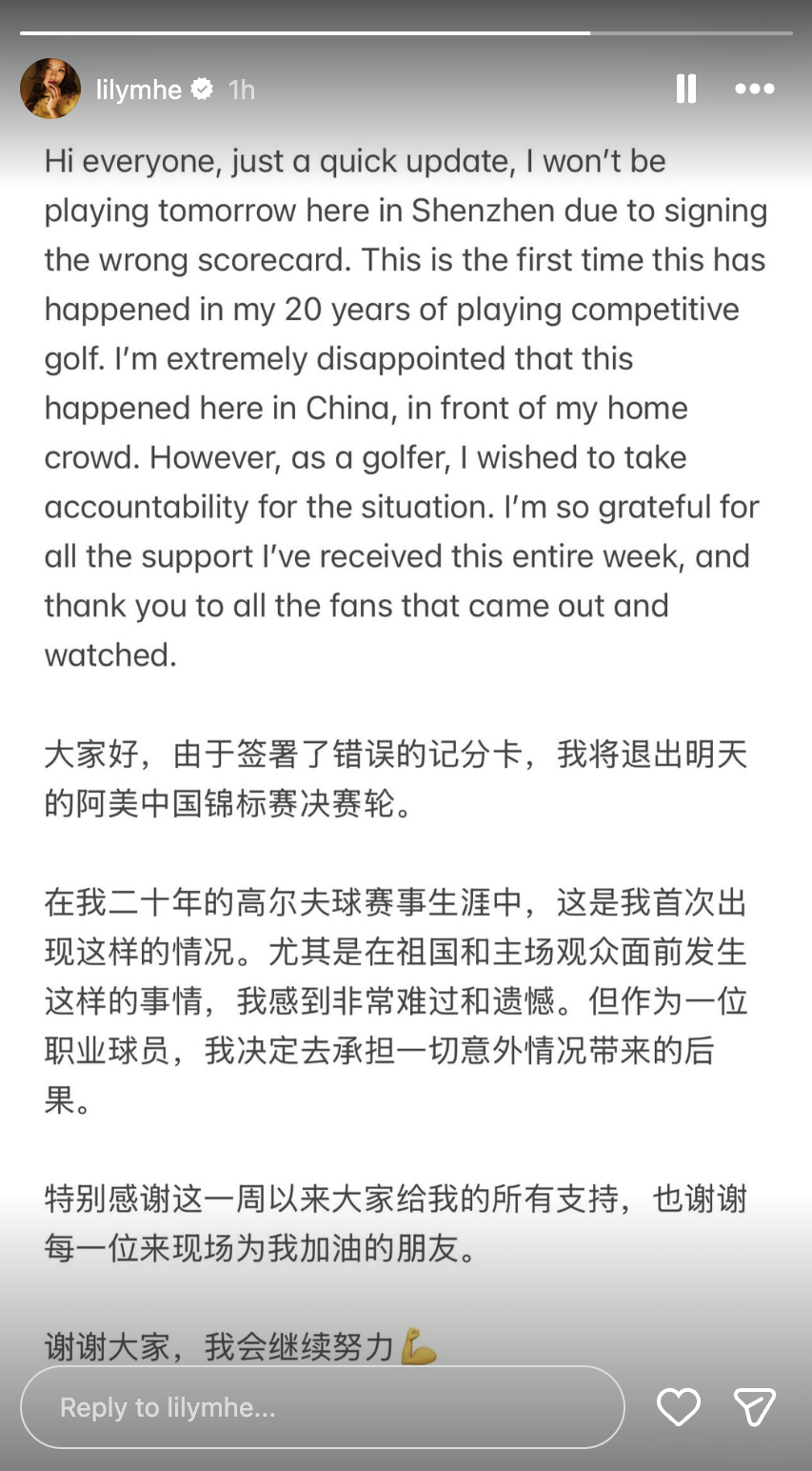 The Chinese golfer was competing at the Aramco China Championship, sponsored by PIF, the Saudi organization backing LIV Golf. She signed an incorrect scorecard and was consequently disqualified from playing the remaining two rounds. Muni He informed her fans via Instagram: “Hi everyone, just a quick update, I won’t be playing tomorrow here in Shenzhen due to signing the wrong scorecard. This is the first time this has happened in my 20 years of playing competitive golf. I’m extremely disappointed that this happened here in China, in front of my home crowd. However, as a golfer, I wished to take accountability for the situation. I’m so grateful for all the support I’ve received this entire week, and thank you to all the fans that came out and watched.”