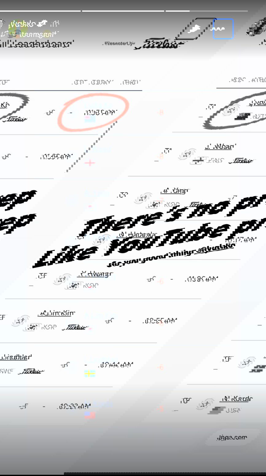 The New Zealander reposted an Instagram story by Tooms Golf, which features the leaderboard. Encircling Ko’s name at the top, the text overlay reads, “There’s no prep like YouTube prep. Go you good thing @lydsko.”