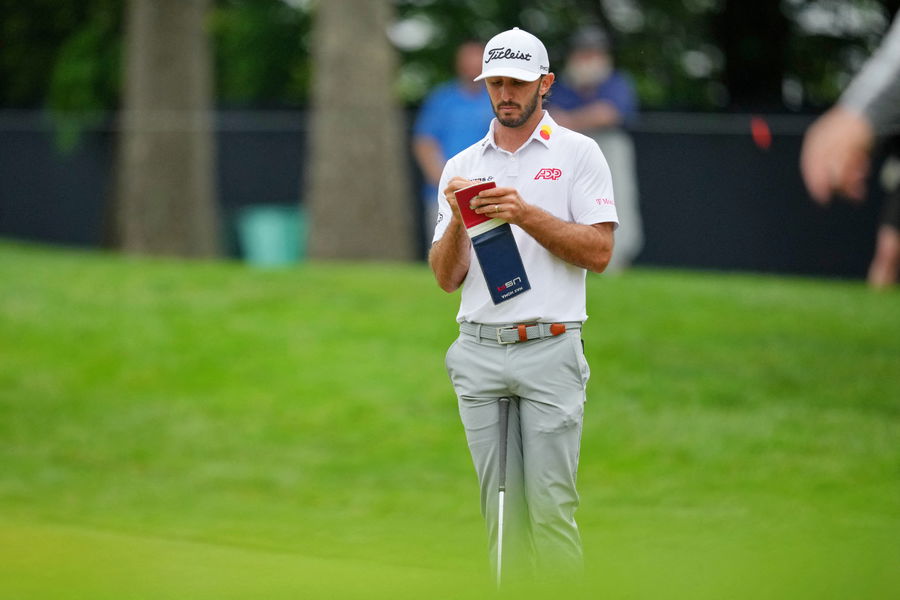 May 15, 2024; Louisville, Kentucky, USA; Max Homa takes notes on the 10th green during a practice round for the PGA Championship golf tournament at Valhalla Golf Club. Mandatory Credit: Aaron Doster-USA TODAY Sports