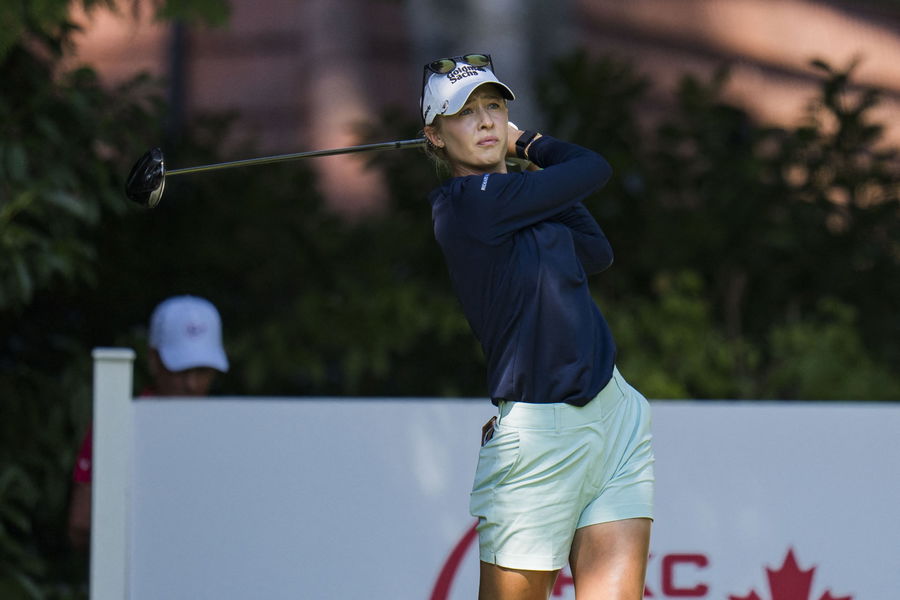 Aug 26, 2023; Vancouver, British Columbia, CAN; Nelly Korda tees off on the fourth hole during the third round of the CPKC Women’s Open golf tournament at Shaughnessy Golf & Country Club. Mandatory Credit: Bob Frid-USA TODAY Sports