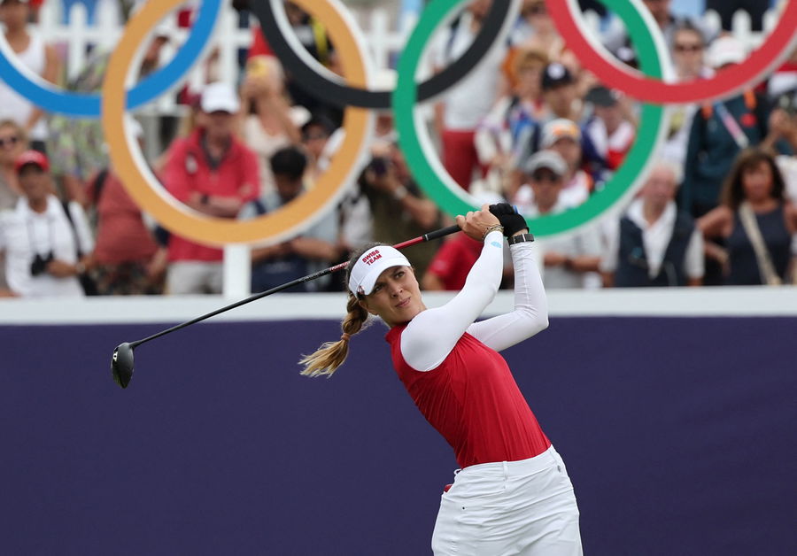 Paris 2024 Olympics – Golf – Women’s Round 3 – Le Golf National, Guyancourt, France – August 09, 2024. Morgane Metraux of Switzerland hits her tee shot on the 1st hole during the third round REUTERS/Lisa Leutner