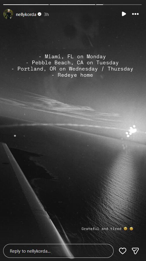 Korda shared a story on Instagram sharing her itinerary from the past few days. She wrote, “- Miami, FL on Monday – Pebble Beach, CA on Tuesday – Portland, OR on Wednesday / Thursday – Redeye home. Grateful and tired 🥱😴”