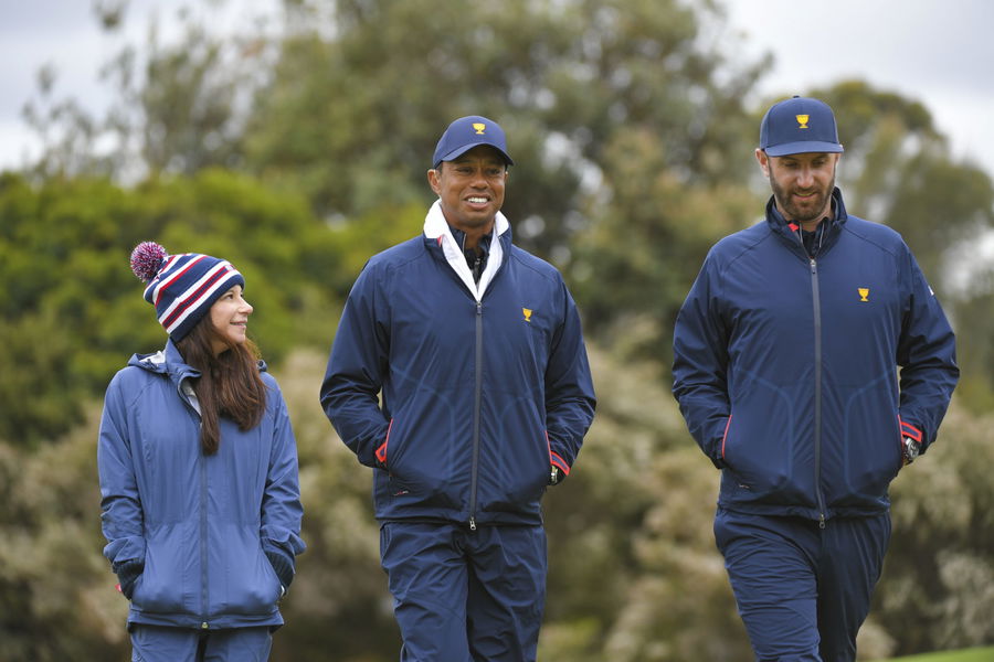 VICTORIA , AUSTRALIA – DECEMBER 14: Erica Herman girlfriend of U.S. Team Captain Tiger Woods, and U.S. Teams Dustin Johnson during the third round of four-ball matches at the Presidents Cup at The Royal Melbourne Golf Club on December 14, 2019, in Victoria , Australia. (Photo by Ben Jared/PGA TOUR via Getty Images)