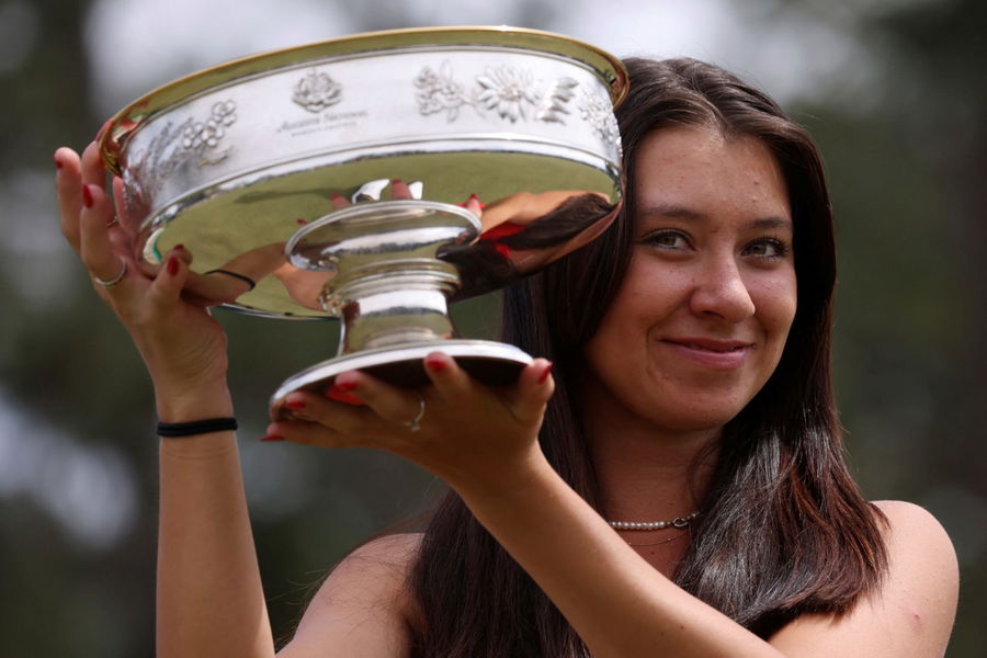 Anna Davis of the United States holds up the trophy after winning the Augusta National Women’s Amateur Championship at Augusta National Golf Club in Augusta, Georgia, U.S., April 2, 2022. REUTERS/Mike Blake