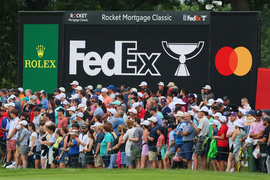 Spectators follow a fairway shot to the green during a three-way playoff with the FedEx Cup sign in the background at the 18th hole the final round of the Rocket Mortgage Classic at the Detroit Country Club on Sunday, July 2, 2023 in Detroit, Michigan. (Photo by Amy Lemus/NurPhoto via Getty Images)