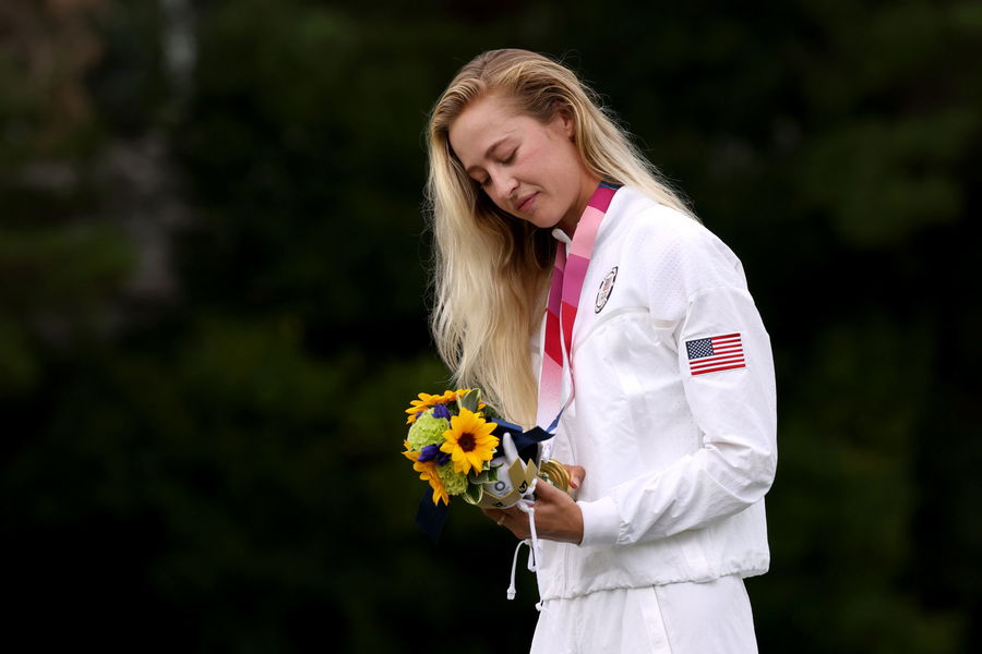 KAWAGOE, JAPAN – AUGUST 07: Nelly Korda of Team United States celebrates with the gold medal at the victory ceremony after the final round of the Women’s Individual Stroke Play on day fifteen of the Tokyo 2020 Olympic Games at Kasumigaseki Country Club on August 07, 2021 in Kawagoe, Japan. (Photo by Mike Ehrmann/Getty Images)