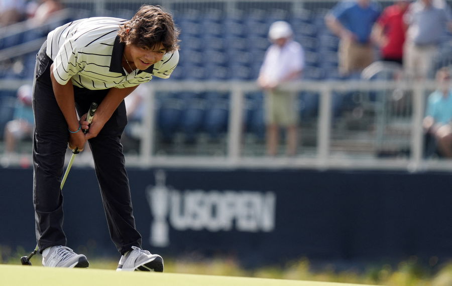 Jun 10, 2024; Pinehurst, North Carolina, USA; Charlie Woods react to his missed putt during a practice round for his dad Tiger Woods for the U.S. Open golf tournament at Pinehurst No. 2. Mandatory Credit: Katie Goodale-USA TODAY Sports