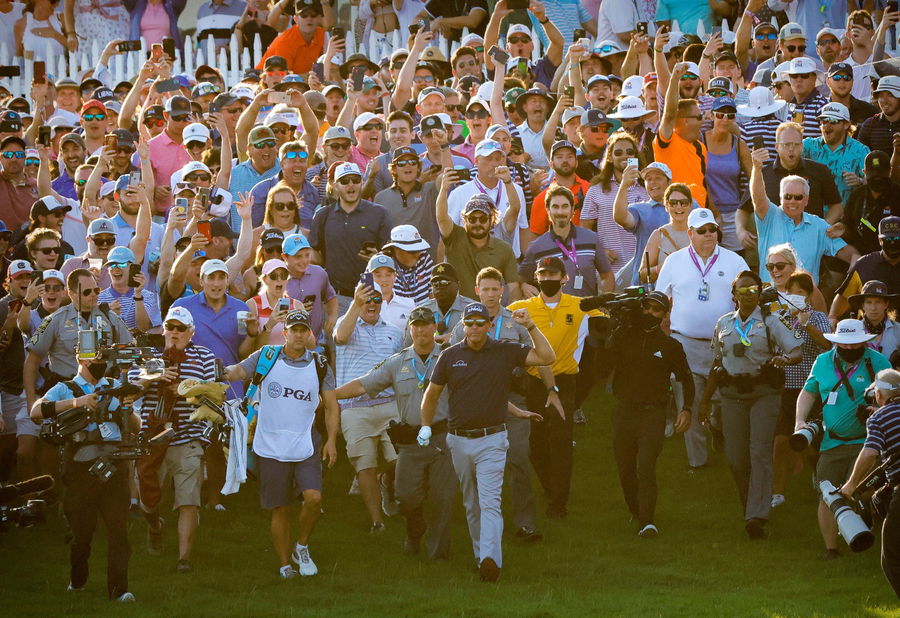May 23, 2021; Kiawah Island, South Carolina, USA; Phil Mickelson and caddie Tim Mickelson walks though the crowd of fans on the 18th hole during the final round of the PGA Championship golf tournament. Mandatory Credit: Geoff Burke-USA TODAY Sports/Reuters