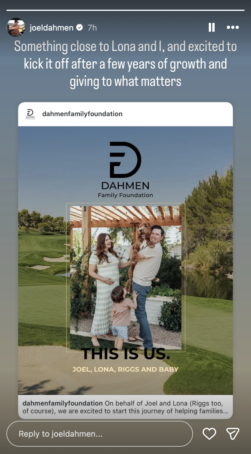 Joel Dahmen announced the creation of the Dahmen Family Foundation, sharing the news by reposting the foundation’s first Instagram announcement on his story. He wrote, “Something close to Lona and I, and excited to kick it off after a few years of growth and giving to what matters.”