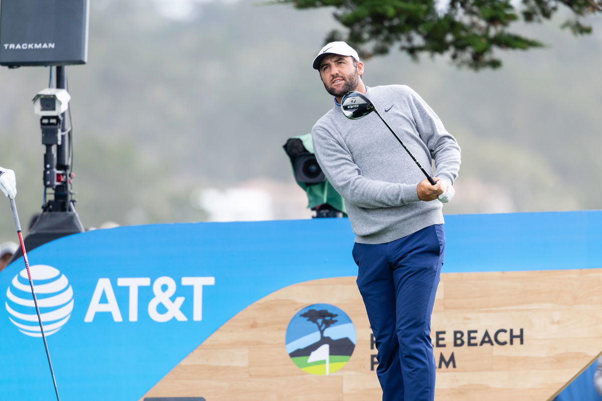 PEBBLE BEACH, CA – FEBRUARY 15: Scottie Scheffler of the United States tees off the 14th hole during the final round of the AT&T Pebble Beach Pro-Am 2026 on February 15, 2026 at Pebble Beach Golf Links in Pebble Beach, CA. Photo by Matthew Huang/Icon Sportswire GOLF: FEB 15 PGA, Golf Herren AT&T Pebble Beach Pro-Am EDITORIAL USE ONLY Icon2602150184