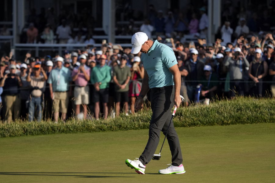Jun 18, 2023; Los Angeles, California, USA; Rory McIlroy reacts after putting on the eighteenth green during the final round of the U.S. Open golf tournament at Los Angeles Country Club. Mandatory Credit: Michael Madrid-USA TODAY Sports