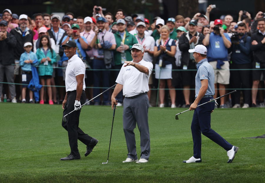 Golf – The Masters – Augusta National Golf Club – Augusta, Georgia, U.S. – April 6, 2022 Tiger Woods, Justin Thomas and Fred Couples of the U.S. on the 16th green during a practice round REUTERS/Mike Blake