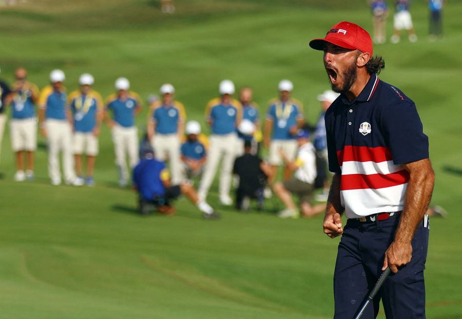 Golf – The 2023 Ryder Cup – Marco Simone Golf & Country Club, Rome, Italy – October 1, 2023 Team USA’s Max Homa celebrates after holing his putt on the 18th hole to win his match during the Singles REUTERS/Carl Recine