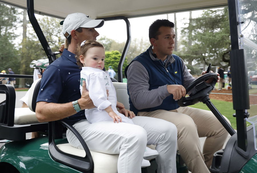 Golf – The Masters – Augusta National Golf Club – Augusta, Georgia, U.S. – April 6, 2022 Northern Ireland’s Rory McIlroy with his daughter Poppy Kennedy on the 1st fairway during the par 3 tournament REUTERS/Mike Segar