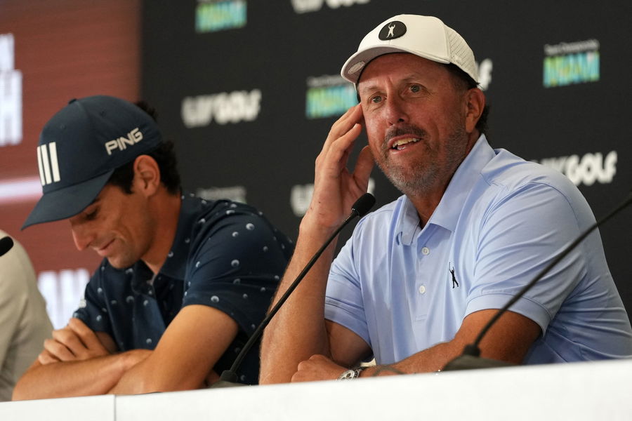 Oct 26, 2022; Miami, Florida, USA; Phil Mickelson speaks while sitting next to Joaquin Niemann during a press conference before the LIV Golf series at Trump National Doral. Mandatory Credit: Jasen Vinlove-USA TODAY Sports