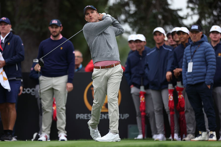 MONTREAL, QUEBEC – SEPTEMBER 25: Russell Henley of the U.S. Team plays his shot from the 10th tee during a practice round prior to the 2024 Presidents Cup at The Royal Montreal Golf Club on September 25, 2024 in Montreal, Quebec, Canada. (Photo by Harry How/Getty Images)