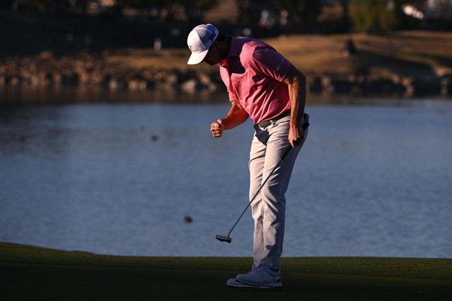 Jan 23, 2022; La Quinta, California, USA; Hudson Swafford reacts after a putt on the 18th green during the final round of the American Express golf tournament at Pete Dye Stadium Course. Mandatory Credit: Orlando Ramirez-USA TODAY Sports