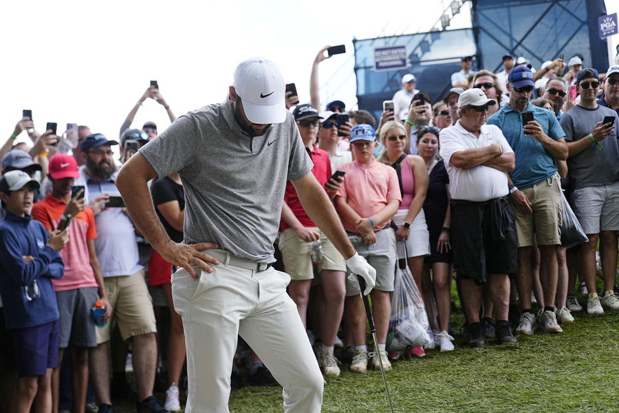 May 18, 2024; Louisville, Kentucky, USA; Scottie Scheffler reacts after a shot on the fourth hole during the third round of the PGA Championship golf tournament at Valhalla Golf Club. Mandatory Credit: Adam Cairns-USA TODAY Sports