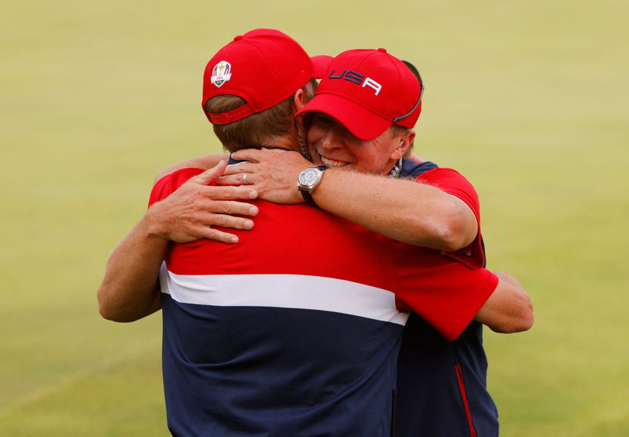 Golf – The 2020 Ryder Cup – Whistling Straits, Sheboygan, Wisconsin, U.S. – September 26, 2021 Team USA captain Steve Stricker celebrates after Team USA win The Ryder Cup REUTERS/Brian Snyder